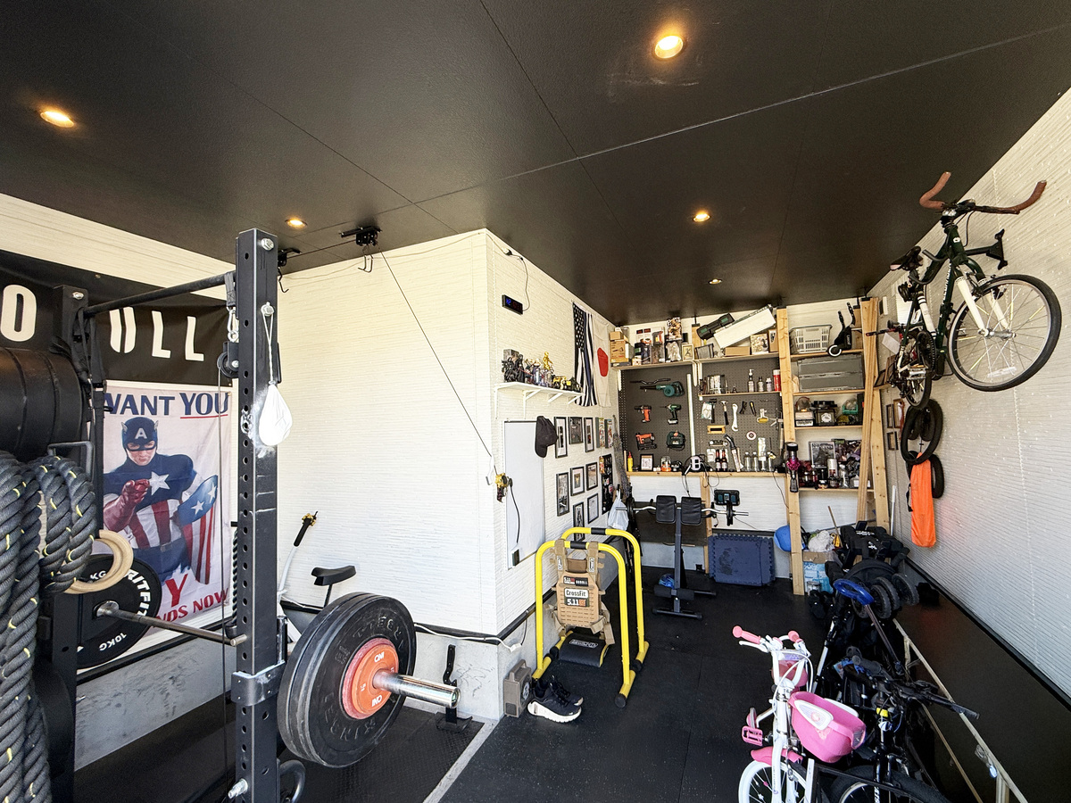 ■車庫以外にも筋トレルームやホビールームとして使える電動シャッター付きガレージ